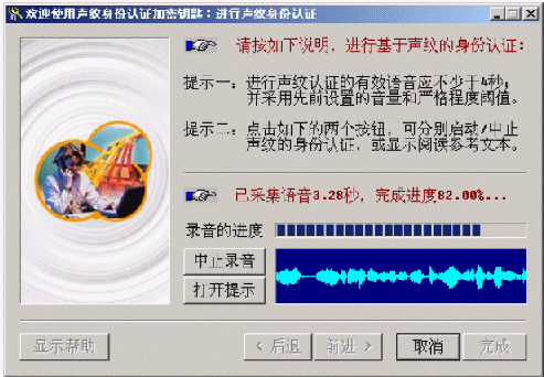 提示:如果原來已經(jīng)提取過該用戶的聲紋信息,且在"聲紋信息的提取"步驟一的窗口上不點擊"提取聲紋"而直接點擊"前進"按鈕,將使用舊的聲紋信息,而僅更新"錄音音量"和"嚴格程度閾值"的設(shè)置。