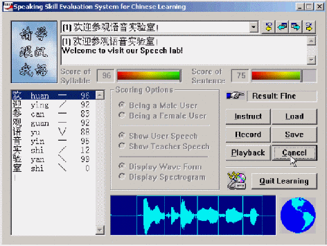 "得意"口語學(xué)習(xí)系統(tǒng)的原理是基于語音音素及其他參數(shù)的提取與分割,將使用者的語音音素系列與標(biāo)準(zhǔn)模型的語音音素序列進(jìn)行自動(dòng)比對(duì),并將比對(duì)結(jié)果通過視圖形象而直觀地給出,從而對(duì)學(xué)習(xí)者的語音給出恰當(dāng)?shù)脑u(píng)價(jià)(比如對(duì)每個(gè)音素給出一個(gè)得分等),以幫助其改進(jìn)和提高口語發(fā)音,使其接近或達(dá)到語音的標(biāo)準(zhǔn)水平。由于利用可視化的朗讀評(píng)分等人機(jī)交互的方式,而且通過視覺、聽覺等綜合手段,反復(fù)提示和幫助用戶接近標(biāo)準(zhǔn)發(fā)音,因而顯著提高了學(xué)習(xí)者的學(xué)習(xí)興趣,這對(duì)提高英語學(xué)習(xí)成績有很多幫助。