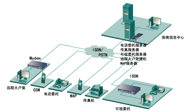 券商證券委托一般包括:電話傳真委托、可視委托(又稱遠(yuǎn)程大戶室)和網(wǎng)上委托等。其中除網(wǎng)上委托可通過Internet網(wǎng)外,其它委托必須通過PSTN網(wǎng)來連接。在當(dāng)前階段,此類委托占有最大的客戶群。以前,每個(gè)券商為了實(shí)現(xiàn)此類委 托,必須在券商中心的機(jī)器上安裝語音卡、傳真卡、座席卡來滿足電話傳真委托,另外還必須在另外一臺機(jī)器上安裝多串口卡和Modem Pool與座席卡相連來滿足可視委托,遠(yuǎn)程大戶室等業(yè)務(wù)。此方案,用戶不僅需要購買很多卡,占用很多機(jī)器插槽,而且在實(shí)現(xiàn)可視委托時(shí),只能接受客戶端PSTN模擬Modem的呼叫,而不能接收目前ISDN的連接方式,速度非常緩慢。本文主要提出了一種采用Eicon Diva Server PRI卡的新型解決方案,本方案不僅省去了在中心插上傳真卡、語音卡、座席卡多種卡,又省去了多串口卡和Modem Pool構(gòu)件,只需在中心的一臺機(jī)器插上1-4塊Diva Server PRI卡后,便能滿足你電話傳真委托、可視委托 、遠(yuǎn)程大戶室等多種業(yè)務(wù),還支持WAP呼叫,SMS短消息發(fā)送等,在可視委托和遠(yuǎn)程大戶室業(yè)務(wù)中,不僅支持PSTN Modem的模擬呼叫,也支持ISDN的數(shù)字呼叫,方案的性價(jià)比極高,方案連接圖如下圖所示: