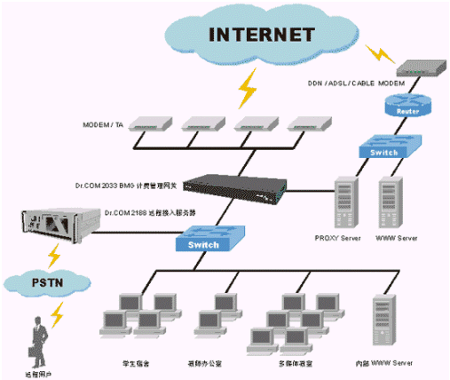 另外,Dr.COM 2033 BMG計(jì)費(fèi)管理網(wǎng)關(guān)本身提供了多種通信線路的接口,支持普通撥號(hào)線、ISDN到專線等各種線路。并集成了包過濾的防火墻,以及采用NAT地址轉(zhuǎn)換協(xié)議,保證了校園網(wǎng)內(nèi)的安全。
