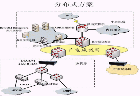 根據(jù)廣電城域網(wǎng)目前網(wǎng)絡(luò)的規(guī)模,以及以后的擴展,采用集中接入認證與計費,統(tǒng)一管理的方案,集中接入指:接入服務(wù)器部署在各個匯聚層的匯聚點,即在網(wǎng)絡(luò)出口安裝寬帶接入服務(wù)器,由寬帶接入服務(wù)器對所有用戶進行身份認證、接入控制、實時計費、數(shù)據(jù)采集,并將賬單和訪問日志等傳送至綜合業(yè)務(wù)系統(tǒng)。統(tǒng)一管理指在中心機房就可以進行全部的管理,包括:網(wǎng)絡(luò)設(shè)備管理;用戶管理;經(jīng)營策略管理;賬務(wù)管理;安全管理;數(shù)據(jù)分析。提供完整的用戶資料分析,使用習(xí)慣分析,運營統(tǒng)計等詳細分析報表。