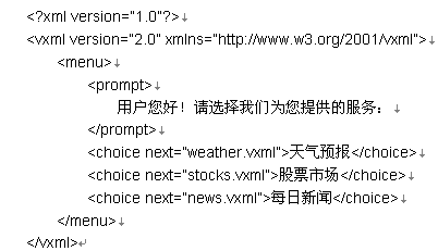 下面是一個VoiceXML的簡單例子。當(dāng)用戶與電話語音系統(tǒng)接通以后,將會聽到語音合成的提示信息"用戶您好!請選擇我們?yōu)槟峁┑姆⻊?wù):"。當(dāng)用戶說"股票市場",語音瀏覽器就會通過語音識別功能識別用戶的選擇,然后把對話流程轉(zhuǎn)向另一個VoiceXML腳本文件stocks.vxml。stocks.vxml腳本文件則是一個專門向用戶提供股票市場相關(guān)服務(wù)的語音網(wǎng)頁。