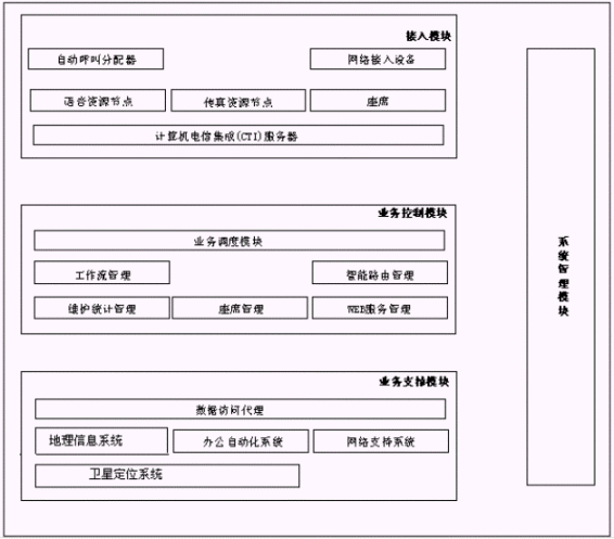 博宇110自動報警與指揮調度系統(tǒng)的邏輯結構由以下四大模塊構成:接入模塊、業(yè)務控制模塊、業(yè)務支撐模塊、系統(tǒng)管理模塊,如下圖所示。其中,接入模塊、業(yè)務控制模塊和業(yè)務支撐模塊構成了整個系統(tǒng)軟件體系結構的三個層次,而系統(tǒng)管理模塊則橫貫始終。