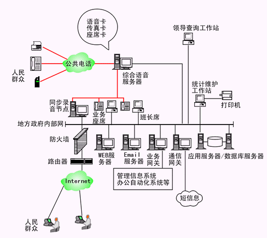 本系統(tǒng)物理結構由帶語音板卡的工控機或排隊交換機、座席分流器、CTI服務器、IVR(交互式語音應答)/IFR(交互式傳真應答)服務器、業(yè)務代表座席、班長座席、統(tǒng)計維護管理工作站、因特網(wǎng)(WEB)服務器、電子郵件(EMAIL)服務器、數(shù)據(jù)庫/應用服務器、業(yè)務網(wǎng)關服務器、錄音留言工作站、領導查詢工作站、網(wǎng)絡系統(tǒng)等構成。