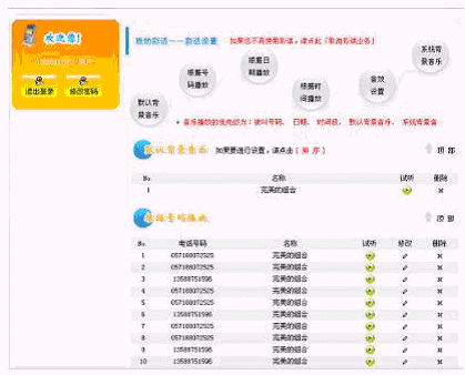 - "彩話DIY"服務(wù):通過(guò)IVR自己錄制BGM素材或通過(guò)因特網(wǎng)上傳BGM素材;