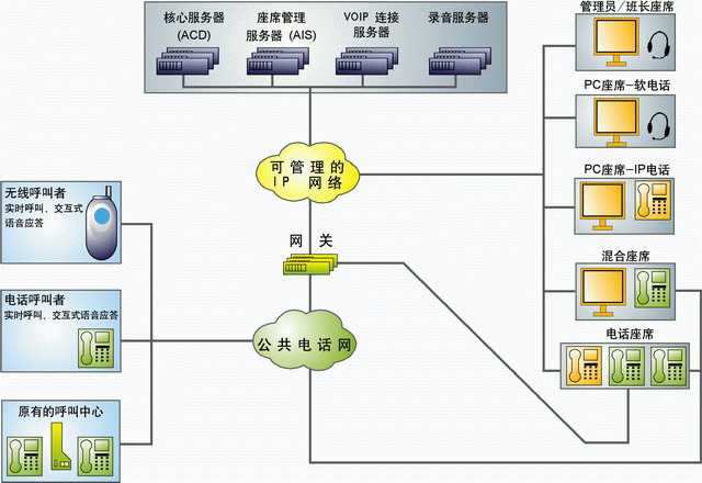 完全克服了傳統(tǒng)的客服中心對座席地理位置的約束,可以在多個地點設有座席和與電信公網(wǎng)的接入點,座席分布在多個地點獨立運營,但由一個中心點來控制和管理。