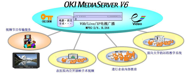 在OKI的通用視頻服務(wù)器系統(tǒng)上,將具有代表性的視頻傳輸功能作為標準服務(wù)要素,以解決方案的形式提供給用戶。以VOD(視頻點播)實時傳輸系統(tǒng)、中繼及監(jiān)視系統(tǒng)為代表,可以簡單便捷構(gòu)筑靈活運用視頻及語音的豐富多彩的系統(tǒng)。URL:http://www.oki.com/jp/BMC/。