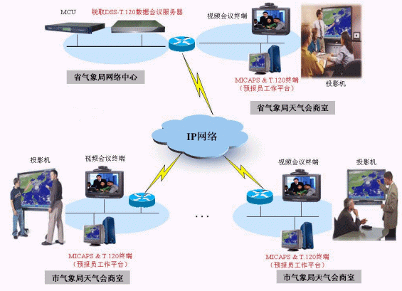 在上圖的應用案例中,DSS-T.120數據會議服務器和MCU通常放置在省氣象局網絡中心,視頻會議終端和預報員工作平臺(MICAPS系統)放置在各級氣象部門的天氣會商室中。在進行遠程可視天氣會商時,系統通過MCU和視頻會議終端進行視頻、音頻的交互;通過DSS-T.120數據會議服務器和運行在預報員工作平臺上的T.120終端軟件進行數據的交互,各級預報員在彼此之間看到圖像聽到聲音的同時,可以看到正在做匯報的預報員共享的MICAPS系統中的內容,如高空圖、地面圖、云圖等預報基礎素材,觀看效果如同在本地會商室一樣。在本案例中通過T.120數據會議系統與視頻會議系統的配合,可以進行視頻、音頻、數據全面的交互,真正實現了預報員之間"面對面"的交流。