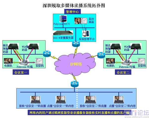 錄播服務(wù)器放置在管理中心,視音頻編碼器(采集聲音、圖像)放置在會議室,VGA編碼器(采集VGA信號)放置在會議室,客戶端分別為網(wǎng)絡(luò)內(nèi)的任意一臺計(jì)算機(jī)。整個系統(tǒng)簡單明了,分布靈活,無需專業(yè)布線即可完成安裝。各部分功能如下: