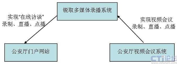如圖所示,銳取多媒體錄播系統(tǒng)前端的視音頻編碼器采集視頻會議系統(tǒng)攝像機拍攝的公安機關領導或?qū)<以诰交流的視頻圖像和交流現(xiàn)場的聲音,將采集的視頻和音頻信號通過網(wǎng)絡傳輸?shù)胶笈_的多媒體錄播服務器中。服務器的錄制模塊將從視音頻編碼器接收到的信號進行同步組合錄制,錄制的文件存儲在服務器的硬盤上。服務器的點播模塊調(diào)用硬盤中已錄制的文件實現(xiàn)點播功能。服務器的直播模塊將從視音頻編碼器接收到的信號分發(fā)到網(wǎng)絡上,需要觀看“在線訪談”直播視頻的網(wǎng)民只需登錄省公安廳政府門戶網(wǎng)站,安裝專用客戶端軟件就能接收到公安機關領導或?qū)<以诰交流的實時內(nèi)容。通過客戶端軟件的在線交流功能,觀看直播的網(wǎng)民還可以向公安機關領導或?qū)<姨釂枺嬲龑崿F(xiàn)了“在線訪談”貼近群眾、服務群眾的目標。