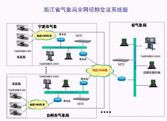 浙江省氣象局為了響應全國氣象系統(tǒng)的號召,充分利用自己網(wǎng)絡資源的優(yōu)勢,于2003年初經(jīng)過系統(tǒng)方案的征集、產(chǎn)品的反復測試,最終確定了由華夏科技代理的挪威TANDBERG的視頻終端,并于2003年9月份簽訂了一期采購合同,共計40多套視頻終端。