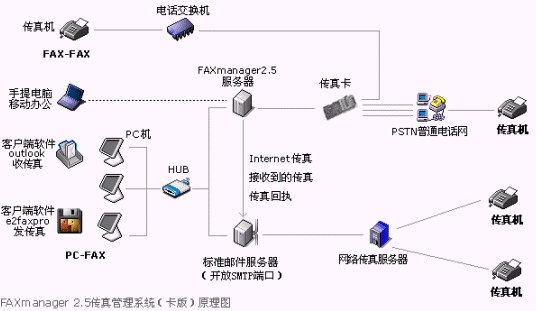 FAXmanager 2.5傳真管理系統(tǒng)安裝在局域網(wǎng)的一臺專用服務(wù)器上,運行環(huán)境可以是:Windows98/NT/2000/XP等,此服務(wù)器可以同郵件服務(wù)器為同一臺機器,構(gòu)成企業(yè)郵件/傳真專用服務(wù)器,F(xiàn)AXmanager 2.5可以和企業(yè)郵件系統(tǒng)或群件系統(tǒng)整合使用,可以是Unix/Linux環(huán)境的Qmail和Sendmail等郵件系統(tǒng),也可以是Microsoft Exchange和Lotus Domino/Notes等群件系統(tǒng),當然也可以是IComMail等企業(yè)郵件系統(tǒng),也支持虛擬主機設(shè)置企業(yè)郵局開設(shè)POP3帳戶和上網(wǎng)代理服務(wù)器的使用環(huán)境。