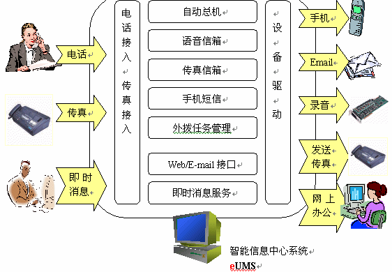 整個(gè)系統(tǒng)以eUMS服務(wù)器為核心,對內(nèi)連接企業(yè)局域網(wǎng),對外連接互聯(lián)網(wǎng)。eUMS內(nèi)配置一塊語音/傳真卡,負(fù)責(zé)電話、傳真的接入。如果企業(yè)需要自己的短信服務(wù),也可以在eUMS服務(wù)器上安裝手機(jī)短信網(wǎng)關(guān),外接一部手機(jī)即可。