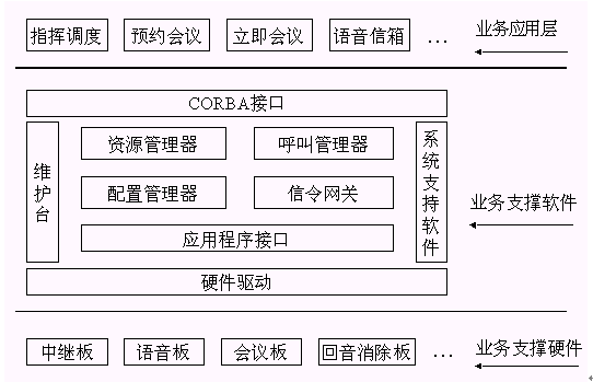 。。其中呼叫管理器通過CORBA技術(shù)向業(yè)務(wù)層提供2個軟件接口,資源管理器通過CORBA向業(yè)務(wù)層提供6個軟件接口。
