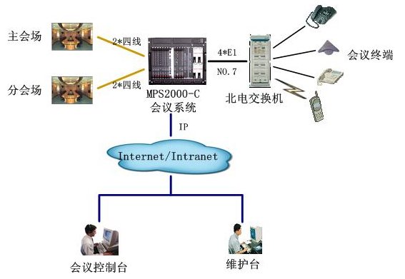 該會議系統(tǒng)通過4個數(shù)字中繼,與北電用戶交換機(jī)互連,采用PRI信令。與視頻會議系統(tǒng)主會場采用四線音頻接口接主會場調(diào)音臺,保證與視頻會議系統(tǒng)音頻的無縫對接。通過以太網(wǎng)口與局域網(wǎng)連接,實(shí)現(xiàn)維護(hù)管理及會議控制等功能。