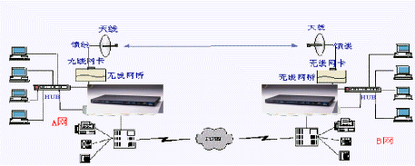 A網(wǎng)與B網(wǎng)分別為兩個(gè)局域網(wǎng),通過(guò)兩臺(tái)WavePoint II無(wú)線網(wǎng)橋?qū)蓚(gè)局域網(wǎng)連在一起,網(wǎng)橋上的RJ45口或BNC細(xì)纜接口與局域網(wǎng)相連。每臺(tái)網(wǎng)橋上插有一塊WaveLAN無(wú)線PC卡,PC卡的射頻輸出端口,通過(guò)饋線接到天線,通過(guò)PC卡來(lái)完成無(wú)線鏈路的連通。無(wú)線網(wǎng)橋連接完成后的效果類似HUB級(jí)連。IP語(yǔ)音網(wǎng)關(guān)-HGW-904的局域網(wǎng)接口(RJ45)連接到局域網(wǎng)的HUB上,根據(jù)用戶實(shí)際的話務(wù)量,選用Line端口接入用戶電話交換機(jī)(PBX),PBX接普通電話機(jī)和傳真機(jī),并連接至電話公網(wǎng)(PSTN)。其中所需設(shè)備:HGW-904
