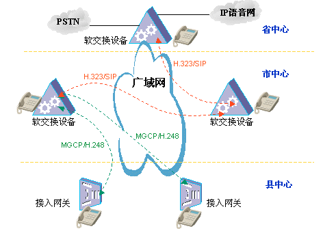 針對這種體系結(jié)構(gòu),軟交換技術(shù)就大有可為了,各地市布置軟交換設(shè)備,其間采用H.323/SIP點對點局間協(xié)議,負(fù)責(zé)各軟交換機(jī)之間的通信,在地市到縣區(qū)之間采用MGCP/H.248協(xié)議,這種協(xié)議體系充分吸取了軟交換體系控制與業(yè)務(wù)分離的思想,具有高度靈活性,可以兼容PSTN、運(yùn)營商IP語音網(wǎng)、原有PBX系統(tǒng)等,并且從多方面保障話音質(zhì)量;管理上由地市軟交換設(shè)備對縣區(qū)的接入網(wǎng)關(guān)設(shè)備進(jìn)行統(tǒng)一管理,號碼進(jìn)行統(tǒng)一分配;同時,由地市軟交換設(shè)備提供多達(dá)數(shù)十種增值業(yè)務(wù),可以實現(xiàn)業(yè)務(wù)的統(tǒng)一升級,簡單方便。