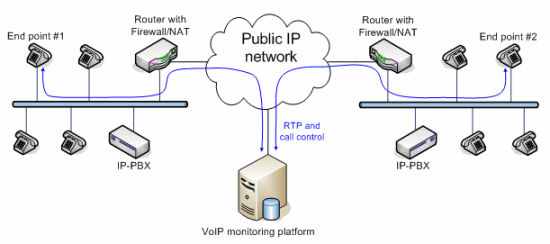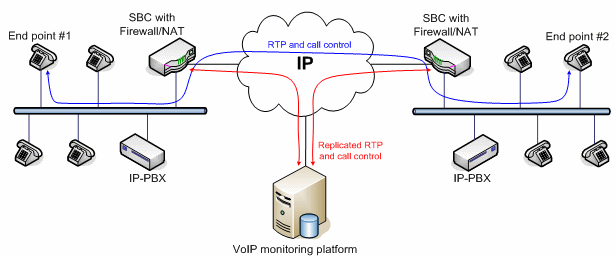 VoIP應(yīng)用的質(zhì)量監(jiān)控分為主動(dòng)式和被動(dòng)式兩種實(shí)現(xiàn)方式。主動(dòng)式的系統(tǒng)能產(chǎn)生呼叫,而被動(dòng)式的系統(tǒng)只是監(jiān)測(cè)進(jìn)行中的呼叫。兩種方法各有優(yōu)勢(shì)。VoIP監(jiān)控方案的架構(gòu)取決于網(wǎng)絡(luò)Edge設(shè)備的類(lèi)型和結(jié)構(gòu)。有些大型企業(yè)采用的VoIP網(wǎng)絡(luò)配備了一種特殊設(shè)備,叫SBC(Session boarder controller),除了完成類(lèi)似路由器的功能外,還能完成流量分配、數(shù)據(jù)/語(yǔ)音信號(hào)加密以及業(yè)務(wù)質(zhì)量控制等功能。此外,通過(guò)過(guò)濾和替換數(shù)據(jù)包內(nèi)的、與用戶有關(guān)的特定信息,SBC還能隱藏公司的網(wǎng)絡(luò)拓?fù)浣Y(jié)構(gòu)和用戶信息,不被外部的IP世界所知道。