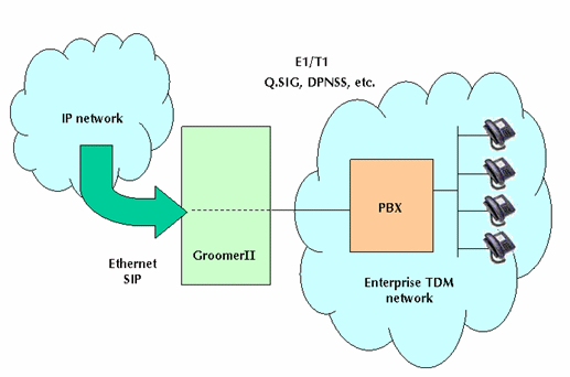 圖3的例子內(nèi),GroomerII安裝了SIP和PRI信令協(xié)議Q.SIG或DPNSS等,以網(wǎng)關(guān)的形式實(shí)現(xiàn)基于IP的網(wǎng)絡(luò)和企業(yè)PBX之間的互連設(shè)備。鑒于以往在傳統(tǒng)PBX方面的投資顯著,這種以變通的方式支持IP語(yǔ)音很重要,也很實(shí)際。