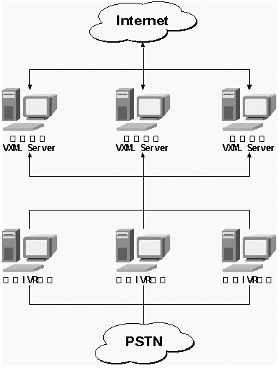 在數(shù)據(jù)中心設(shè)置VXML服務(wù)器,提供訪問互聯(lián)網(wǎng)絡(luò)的接口,地市臺與中心服務(wù)器使用標(biāo)準(zhǔn)的基于應(yīng)用層的協(xié)議通訊。地市臺與數(shù)據(jù)中心交換網(wǎng)頁和其他數(shù)據(jù),這種交換是實時的。各地市的電話用戶就能利用運(yùn)營商提供本地電話號碼訪問互聯(lián)網(wǎng)上的信息。