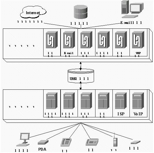 UMS系統(tǒng)將電話網(wǎng)、尋呼網(wǎng)、移動網(wǎng)、互聯(lián)網(wǎng)相互融合,在各個不同網(wǎng)絡(luò)間提供通信和信息交換,向最終用戶提供在任何時間、任何地點,以任何方式(如人工電話、自動語音、自動傳真、尋呼、手機(jī)短訊、手機(jī)上網(wǎng)、電子郵件、WWW瀏覽等)的個人通信服務(wù)、個人化信息內(nèi)容服務(wù)和個人化電子商務(wù)服務(wù)。