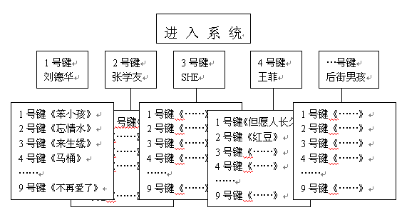 眾所周知,目前大多數(shù)電話機(jī)和手機(jī)的操作鍵盤都只有0-9十個(gè)數(shù)字鍵和*號(hào)和#號(hào)兩個(gè)符號(hào)鍵,因此在設(shè)計(jì)導(dǎo)航菜單的時(shí)候很受限制。比如在點(diǎn)歌節(jié)目中,用這些數(shù)字鍵來(lái)指代上千首歌曲是根本不可能的。以前多采用的方法有兩種:一是預(yù)先給用戶發(fā)送歌曲手冊(cè),上面可以查到每首歌曲的代號(hào)。這種方式的缺點(diǎn)是實(shí)時(shí)性差,不能隨時(shí)更新歌曲庫(kù)。另外印刷宣傳資料帶來(lái)的人力和成本也不容忽視;另一種方法是將歌曲根據(jù)歌手、主題進(jìn)行分類,比如下圖所列的結(jié)構(gòu):