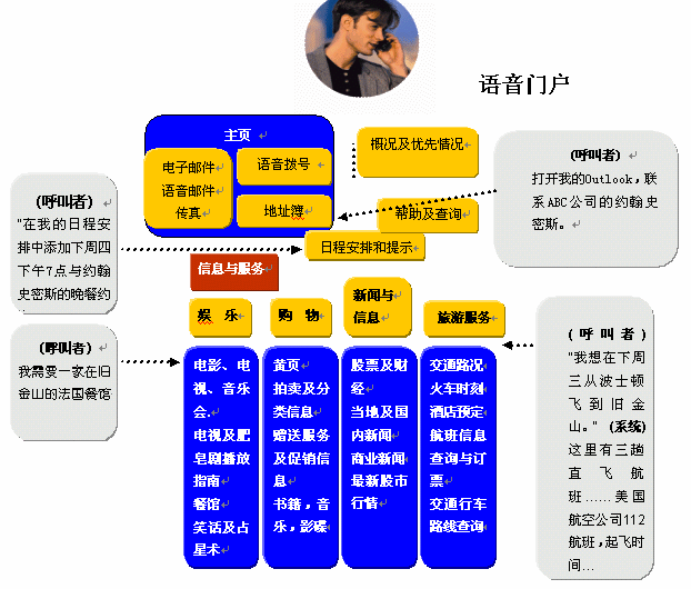 基于在語(yǔ)音識(shí)別技術(shù)準(zhǔn)確度上已有突破性的進(jìn)展,因此可以利用語(yǔ)音,不僅僅是改變?cè)械逆I盤輸入查詢方式,而且能夠使自動(dòng)應(yīng)答系統(tǒng)處理更加復(fù)雜的情況。用戶撥打服務(wù)電話的時(shí)候,只需說(shuō)出他/她的需求即可。如在電子黃頁(yè)業(yè)務(wù)中,用戶要查詢關(guān)于A公司的情況,服務(wù)電話接通以后就可以直接說(shuō)出"A公司",而不要按鍵通過(guò)一層層的菜單目錄,然后系統(tǒng)就能自動(dòng)播報(bào)出該單位介紹信息和聯(lián)系方式等。