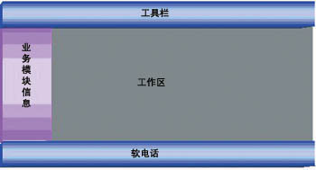 軟電話提供標準的呼叫控制功能,如座席的登錄、注銷等。業(yè)務(wù)模塊信息根據(jù)該座席的技能設(shè)置顯示該座席能夠使用的座席業(yè)務(wù)模塊,工作區(qū)是座席使用業(yè)務(wù)模塊的區(qū)域,業(yè)務(wù)模塊的調(diào)入可以是系統(tǒng)根據(jù)自動服務(wù)傳遞的參數(shù)自動彈出,也可以是座席人員手工選擇相應(yīng)的業(yè)務(wù)操作。同時,業(yè)務(wù)模塊通過標準的接口和軟電話模塊進行通信,取得或者設(shè)置系統(tǒng)的呼叫參數(shù)或操作,包括提取系統(tǒng)主被叫號碼、用戶按鍵等。通過工具欄提供系統(tǒng)的菜單、快捷鍵、快捷按鈕的使用。通過這種方式,系統(tǒng)可以隨時增加、修改座席的業(yè)務(wù)模塊,而無須修改整個座席端,有利于系統(tǒng)業(yè)務(wù)的分步實施,大大縮短了系統(tǒng)的整個建設(shè)周期。