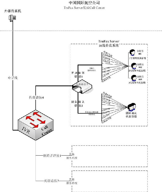 與國(guó)航Call Center集成后的TraFax Server系統(tǒng)共有16條傳真線路,其中一半專門(mén)用作接收普通旅客發(fā)來(lái)的傳真,另外8條線路則是為受理團(tuán)體客戶的傳真確認(rèn)而設(shè)。二者不同是,普通客戶在向國(guó)航發(fā)送傳真的過(guò)程中需要根據(jù)系統(tǒng)提示音在發(fā)送前的最后環(huán)節(jié)中輸入明確的坐席分機(jī)號(hào)碼,以使傳真文件發(fā)向分機(jī)號(hào)對(duì)用的坐席傳真信箱中,以此實(shí)現(xiàn)坐席人員對(duì)旅客的一對(duì)一式服務(wù),從而提高服務(wù)水平。而團(tuán)隊(duì)確認(rèn)的傳真無(wú)需輸入坐席分機(jī)號(hào),傳真將被空閑的線路直接發(fā)送到一個(gè)專門(mén)的團(tuán)隊(duì)確認(rèn)傳真信箱中,從而確保國(guó)航對(duì)該類傳真的快速處理能力。目前,16線的TraFax