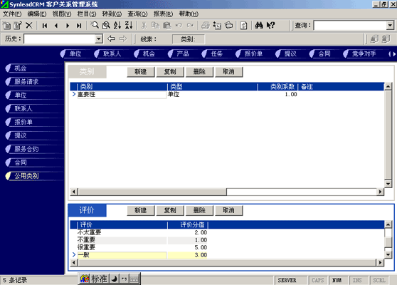 客戶單位的分類較聯(lián)系人的分類更復(fù)雜。常用的分類有:按照企業(yè)規(guī)模來分類(大、中、小,層次自定義,下同)、按照該客戶與本單位的緊密程度分類(緊密、普通、疏遠(yuǎn))、按照該客戶的重要性分類(重要、普通、次要)、按照該客戶的忠誠度分類(忠誠、普通、游移)。有一些用戶企業(yè),希望對客戶單位特征進(jìn)行采集,進(jìn)而進(jìn)行客戶信用評價。信用特征的類別可以多達(dá)數(shù)十種類(詳細(xì)情況可參考有關(guān)書籍)。利用SynleadCRM,您可以為每個類指定系數(shù),為類下屬的每個評價指定評分分值。例如,您可以建立一個類別為"客戶倉庫積壓商品的情況",系數(shù)為1,該類別下屬的評價有"很多1分"、"一般3分"、"少1分"、"未知0分",如果指定某客戶該類別的評價為一般,則該項目得分為3分*1(系數(shù))=3分。依此類推,您還可以指定更多的分類與評價,例如:客戶經(jīng)營場所所處的位置、客戶在企業(yè)生命周期中所處的位置、客戶在行業(yè)中的地位、客戶產(chǎn)品的組合情況、客戶產(chǎn)品覆蓋的市場范圍、客戶產(chǎn)品的淡旺季規(guī)律、客戶近年營業(yè)額的增減趨勢、客戶的年度營業(yè)額、客戶的現(xiàn)金周轉(zhuǎn)能力、客戶的負(fù)債情況、客戶是否涉及中大訴訟等。每一個類別項目的評分經(jīng)過系數(shù)的加權(quán)運算后,可以求和,得到這個客戶的總評分。未來也可以利用分析模型對此類數(shù)據(jù)進(jìn)行進(jìn)一步的分析,提供輔助決策所需要的圖表和報表。