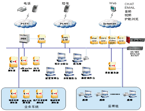 。。系統(tǒng)采用PBX提供完備的呼叫控制功能,能夠滿足呼叫中心電話應(yīng)用的需要,實現(xiàn)呼入、呼出、內(nèi)部通話、保持、接回、咨詢、轉(zhuǎn)接、會議等各種電話控制功能;同時,PBX具有CTILink接口,可實現(xiàn)與計算機系統(tǒng)的連接。