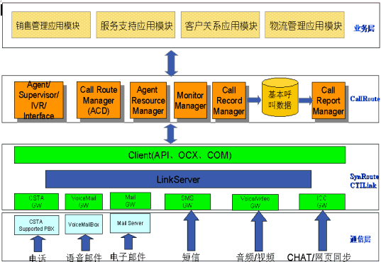 。。CallRoute平臺是一個基于CSTA標(biāo)準(zhǔn)、支持分布互連的呼叫中心平臺。商路通呼叫中心平臺全套產(chǎn)品包括多個服務(wù)部件,客戶端的接口部件(OCX、DLL)以及功能豐富應(yīng)用工具。我們的軟件系統(tǒng)采用先進(jìn)的軟件工程設(shè)計方法,整個系統(tǒng)的軟件結(jié)構(gòu)體系遵循以下設(shè)計原則: