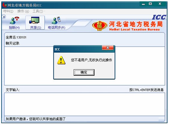 7. 遠(yuǎn)程共享:考慮到對納稅人電腦的安全保護(hù),座席端沒有權(quán)利主動共享納稅人的桌面,即坐席不能點(diǎn)擊共享按鈕,如果點(diǎn)擊,將彈出對話框友好提示:“您不是納稅人,無權(quán)執(zhí)行此操作”如下圖: