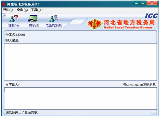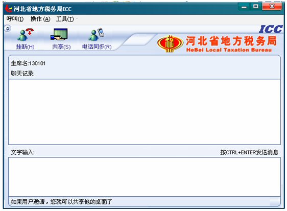 收到納稅人共享請求提示,如果坐席現(xiàn)在為全屏,收到納稅人共享請求,ICC界面將會自動跳到全屏的前端,彈出共享框。如果坐席現(xiàn)在不是全屏,收到納稅人共享請求,任務(wù)欄里ICC對話框?qū)⒆詣娱W爍,彈出共享框。