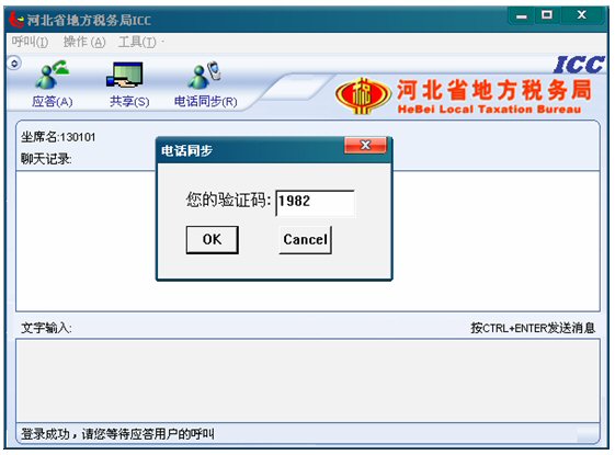 坐席只需通過電話將此框中的驗(yàn)證碼(比如圖例中的1982驗(yàn)證碼)告訴和坐席通話的納稅人。然后點(diǎn)擊OK按鈕。納稅人端得到坐席告訴他的驗(yàn)證碼后,納稅人端也有個(gè)電話同步按鈕,納稅人點(diǎn)擊并輸入坐席告訴他的驗(yàn)證碼后,坐席就可以看到有呼叫進(jìn)來。此呼叫就是正和坐席通話納稅人的ICC呼叫。坐席點(diǎn)擊應(yīng)答后就可以和此納稅人ICC