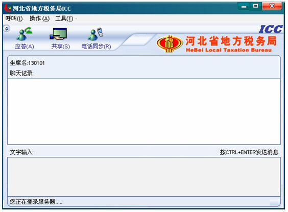 2. 點(diǎn)擊12366界面下面一行按鈕中的ICC按鈕,運(yùn)行起來ICC。出現(xiàn)ICC界面,此時(shí)ICC處于登錄服務(wù)器狀態(tài),左下角的狀態(tài)欄有文字提示“您正在登錄服務(wù)器……”。聊天記錄對話框的上面有坐席名,例如“坐席名:130101”如下圖:
