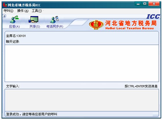 3. 稍等片刻,ICC登錄成功,此時(shí)坐席就可以等待納稅人的呼叫了,左下角狀態(tài)欄有文字提示“登錄成功,請等待應(yīng)答用戶的呼叫”。如下圖: