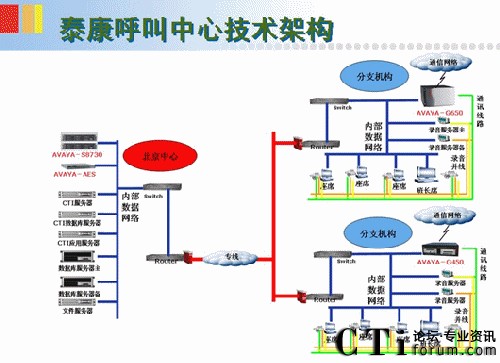 泰康電銷中心采用交換機+CTI+錄音+應(yīng)用系統(tǒng)組成。在中心點普遍采用交換機模式。當(dāng)中心點坐席規(guī)模大于60席位以數(shù)字中繼模式接入。當(dāng)分點新建數(shù)量不足60座席時,采用遠(yuǎn)端模式,相應(yīng)采用交換機遠(yuǎn)端模塊+CTI+錄音+應(yīng)用系統(tǒng)組成。
