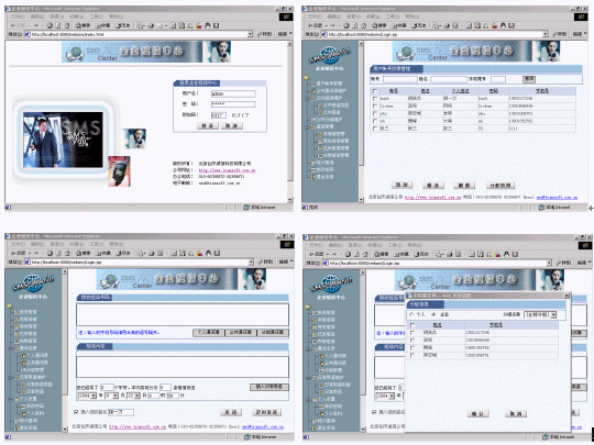企業(yè)里的每個用戶要實現(xiàn)短信發(fā)送,僅需一臺電腦,然后利用瀏覽器就可以實現(xiàn)分組發(fā)送(如:會議通知、緊急通知)、定時群發(fā)(如:提醒短信、恭賀短信、祝福短信)、以及接收工作情況匯報短信等,系統(tǒng)提供通訊薄管理,可編輯常用短語。服務(wù)器端支持多個GSM設(shè)備群發(fā),滿足不同發(fā)送短信量的需要?煨┫螺d系統(tǒng)的動畫演示,新增功能多多。!