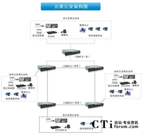 云南省公安廳視頻系統(tǒng)全網(wǎng)建設(shè)結(jié)構(gòu)分為三級:共有146臺MCU,使用的是省廳—地州、市—縣級的3級樹狀級聯(lián)模式組網(wǎng)。整個項目遍布整個云南省公安系統(tǒng),項目實施至16個地州市、129個縣以及各縣轄區(qū)所有的派出所、戒毒所、看守所。會場數(shù)目前約有2200個,還在陸續(xù)增加中。同時支持調(diào)用縣級公安局指揮中心監(jiān)控視頻編碼器的實時監(jiān)控圖像。