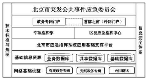 根據(jù)北京市《應(yīng)急指揮系統(tǒng)信息化技術(shù)支撐體系》,北京市的應(yīng)急系統(tǒng)能夠體系結(jié)構(gòu)細(xì)化為下圖: