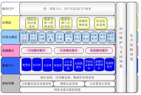 整個(gè)系統(tǒng)的底層是信息系統(tǒng)的基礎(chǔ)設(shè)施,這包括網(wǎng)絡(luò)及通訊設(shè)施、主機(jī)服務(wù)器及存儲系統(tǒng)、視頻會議系統(tǒng)、大屏幕數(shù)據(jù)演示系統(tǒng),以及操作系統(tǒng)、數(shù)據(jù)庫管理系統(tǒng)及網(wǎng)絡(luò)通訊基礎(chǔ)設(shè)施等,這些是系統(tǒng)最基本的運(yùn)行基礎(chǔ)。