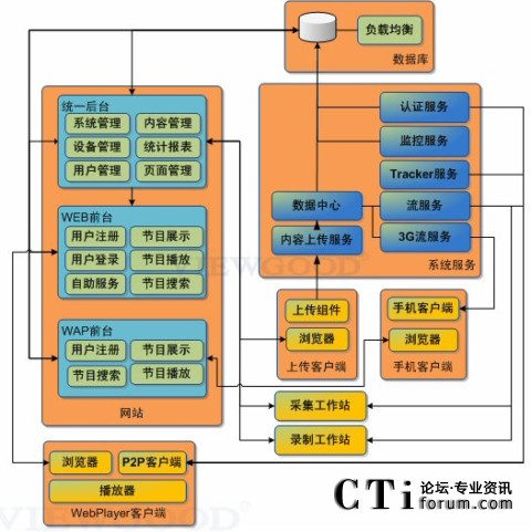 系統(tǒng)由“統(tǒng)一”管理后臺(tái)、Web前臺(tái)、WAP前臺(tái)、WebPlayer播放器、手機(jī)客戶(hù)端、采集工作站、錄制工作站、上傳客戶(hù)端、服務(wù)系統(tǒng)組成。之前已經(jīng)使用我們PC流媒體服務(wù)平臺(tái)的用戶(hù),可以與手機(jī)流媒體系統(tǒng)合用一個(gè)后臺(tái)管理,實(shí)現(xiàn)了手機(jī)和PC平臺(tái)的統(tǒng)一后臺(tái)管理。