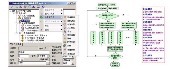 產(chǎn)品化、標(biāo)準(zhǔn)化、全功能、低價位,易于安裝使用,便于應(yīng)用集成,為用戶實現(xiàn)呼叫中心應(yīng)用節(jié)省了大量的資金、人力、時間;無需編程,可自定義呼叫服務(wù)流程,豐富的業(yè)務(wù)插件可以直接配置訪問后臺數(shù)據(jù)庫,滿足各類應(yīng)用需要;組件式構(gòu)造,易于擴(kuò)容和功能擴(kuò)展。