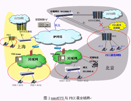 我們建設(shè)mindSYS系統(tǒng)的時候基本上不改變原來PBX的布線和配置,PBX原來的數(shù)字中繼直接連接到運(yùn)營商的程控交換機(jī),我們現(xiàn)在只是將PBX的數(shù)字中繼連接到中繼網(wǎng)關(guān)MG3000-T。PBX通信系統(tǒng)的電話完全沒有改變,還使用原來的電話號碼,打分機(jī)直接撥小號,打外線先撥0。mindSYS系統(tǒng)下的電話使用方式也完全一樣,對用戶來說就是一套系統(tǒng)。如北京的6011可以直接撥打6111,6111用戶也可以直接撥打6011,6111打外線先撥0,如062043020。北京的用戶呼叫異地用戶需要撥打完整號碼(大號),如北京的6011用戶撥0216111就可以接通上海的用戶,反之亦然。mindSYS系統(tǒng)的電話(圖2的所有電話)之間通話都免費(fèi)。這樣我們的行業(yè)用戶可以既不改變原來的使用習(xí)慣,又能夠靈活的規(guī)劃各地的電話號碼來完成一個大型的跨地域的電話系統(tǒng)。