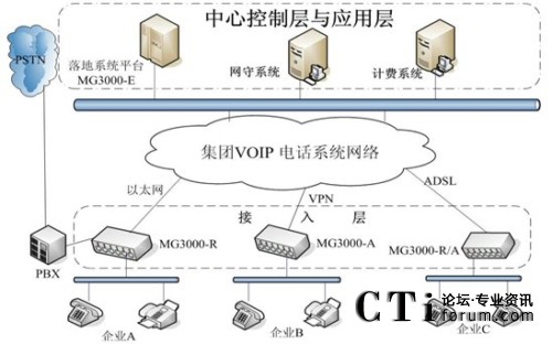 各單位利用自己的網(wǎng)絡(luò)組建集團(tuán)VOIP語音網(wǎng)絡(luò)。無論是在國內(nèi)的各單位總部及其分支還是海外的企業(yè)分支,不管是通過專網(wǎng)還是ADSL等連入集團(tuán)管理平臺,都可以利用這個管理平臺傳輸語音業(yè)務(wù),總部和各分支機(jī)構(gòu)可以通過不同的網(wǎng)絡(luò)接入手段。