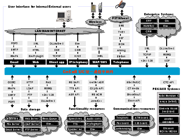 UC統(tǒng)一通信平臺是通信開發(fā)平臺的世界領(lǐng)先者, 提供功能強大而又迅速的開發(fā)技術(shù)來建立復(fù)雜的企業(yè)通信服務(wù)。這些技術(shù)包括CTI,傳真,數(shù)據(jù)通信,電子郵件,VXML, HTML,ASR,TTS, WAP,數(shù)據(jù)庫接入等。標準接口讓我們方便的與企業(yè)CRM、ERP、OA等系統(tǒng)連接。