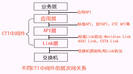 根據(jù)CTI的功能定位,我們可以把CTI產(chǎn)品劃分為不同的層次,一般地可分為三種類型:Link層產(chǎn)品、API層產(chǎn)品、應(yīng)用層產(chǎn)品,其分層結(jié)構(gòu)示意圖如下所示:
