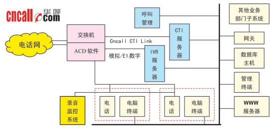 華呼(www.cncall.com)典型的基于交換機平臺廣電呼叫中心解決方案的主系統(tǒng)包括:PBX交換機平臺、計算機電話集成系統(tǒng)(CTI)、交互式語音應答系統(tǒng)(IVR/IFR)、人工座席系統(tǒng)、電話錄音監(jiān)聽管理系統(tǒng)CCLog、呼叫中心管理系統(tǒng)CCM、數據庫應用系統(tǒng)、WWW服務器、應用網關。
