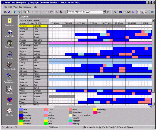 絕大多數(shù)的WFMS可以通過歷史數(shù)據(jù)和人員情況自動生成排班表。而且它也只是簡單的根據(jù)呼叫中心的運營時間來排班。舉個例子,某個呼叫中心在排班是有兩個班,一個工作時間是早7點到下午3點,另一個是早九點到晚五點,這就意味著不僅要安排早、晚休息,還要顧及到午休的時間。休息的安排要保證能夠在電話的持續(xù)中也能有持續(xù)的人員保證電話量。在這個自動化軟件的之中還有一個因素要能夠?qū)崿F(xiàn)自動化--人的因素。例如:Mary和Jane想同時去吃午餐,然而自動化的排班表并不是這樣的。然而主管根據(jù)當(dāng)時的話務(wù)量情況和工作狀況以及工作規(guī)范批準(zhǔn)了Mary和Jane共享午餐的要求,而WFMS就要能夠處理這樣很有可能發(fā)生,而且是合理的情況。排班表的更改應(yīng)該就是簡單的拖拽圖標(biāo)就應(yīng)該能夠?qū)崿F(xiàn)的功能,并且能夠在這種更改會對預(yù)測的話務(wù)量差生不好影響時,拒絕這種拖拽行為。